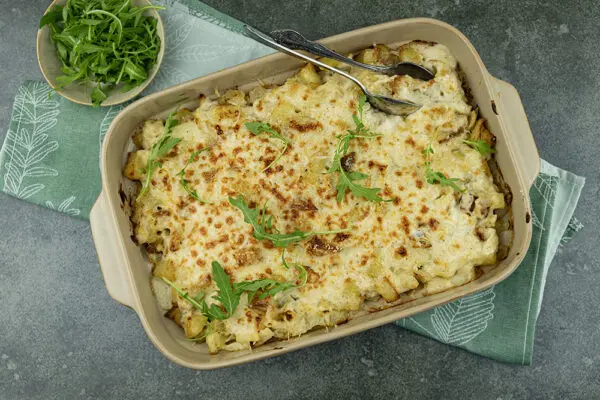 Ze stapelen hem met aardappelen in een ovenschaal. Daarna toppen ze het geheel af met gegratineerde kaas. Het resultaat? Een smeuïge, smaakvolle en vullende maaltijd waar je niet genoeg van kunt krijgen.
