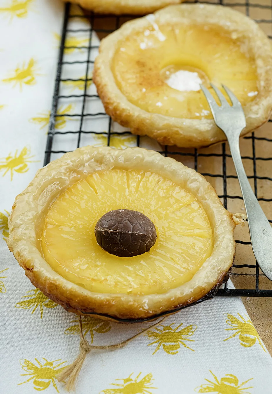 Bladerdeeg gebakjes met ananas zijn perfect voor de Paasbrunch door de kleur en door te versieren met chocolade eitjes.