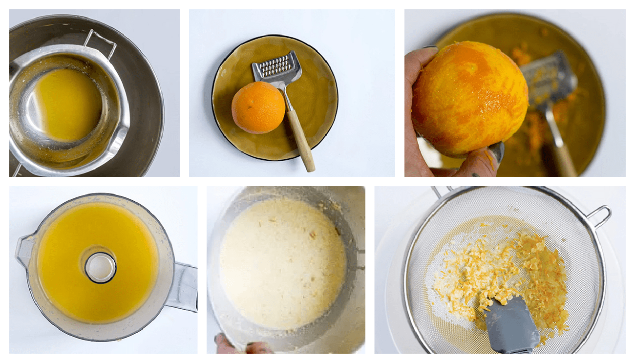 Voeg de suiker, de gesmolten margarine, de schil en het sap van een sinaasappel, de eieren en de dooiers toe. Begin in het midden te roeren en ga door tot alle ingrediënten gemengd zijn.