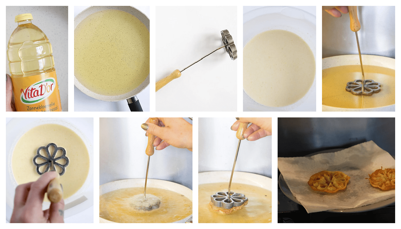 Vervolgens ga je het voorzichtig in de hete olie dompelen en neergaande bewegingen maken om de filhoses los te maken. Als het los komt van het rozetijzer, draai je de filhose om aan de andere kant te bakken.