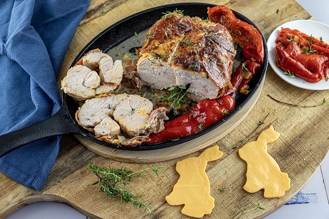 Als final touch garneer je de gevulde kipfilet met wat blaadjes verse tijm. Serveer daarna direct. Smakelijk eten en een vrolijk Pasen.