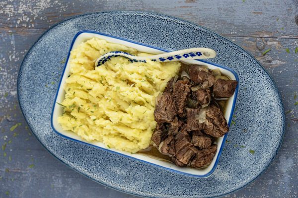 • Als final touch meng je er nog een eetlepel dragon doorheen. Serveer op een bord, maak een kuiltje en doe daar een flinke soeplepel stoofvlees met saus in.