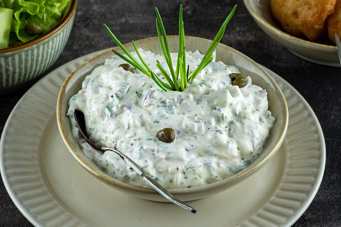 In een ruime kom doe je de fijngesnipperde sjalotten. Voeg daarbij de mayonaise, crème fraiche, mosterd, kappertjes, augurkjes, dragon, bieslook, peterselie en suiker. Meng dit alles heel goed zodat alle ingrediënten goed gemixt worden.