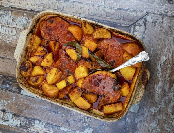 • Ondertussen heb je tijd om de aardappelen te schillen en in grove stukken te snijden. Leg in een kom en doe hier 1 eetlepel paprikapoeder en een paar flinke scheuten olijfolie bij. Meng het geheel met de hand.