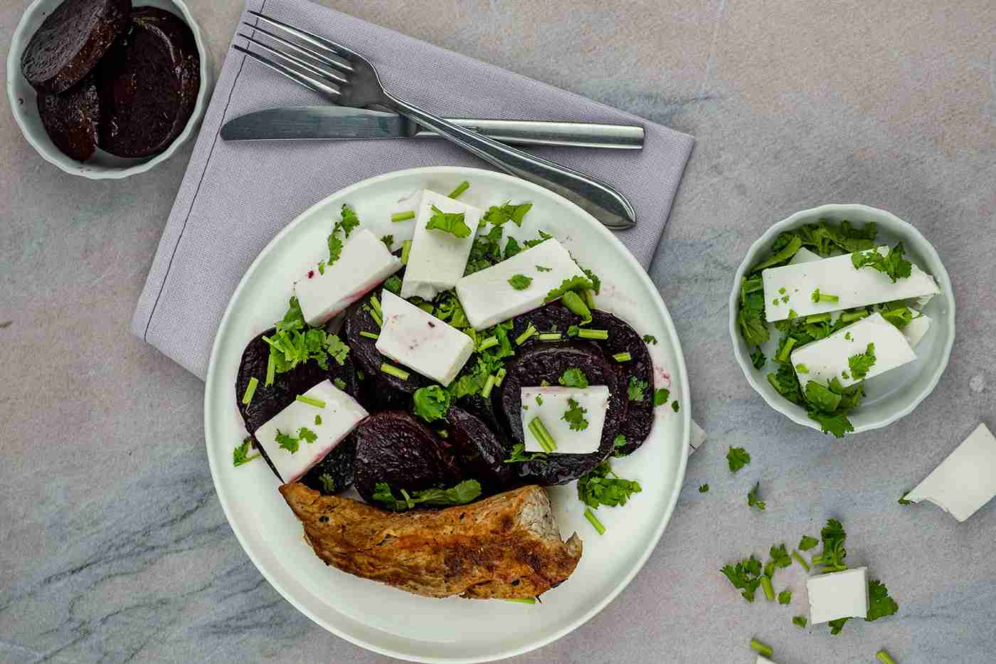 Serveer de rode bietjes direct samen met de varkenshaas. Leg enkele plakjes Griekse kaas over de rode bietjes en garneer het geheel met verse koriander. Buon apetito!
